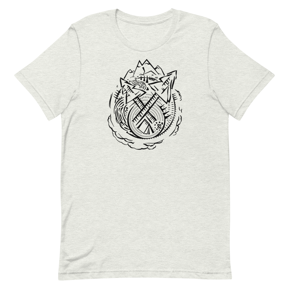 The original Camping Circle design on heather grey Unisex Shirt.